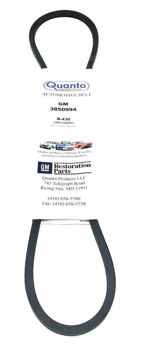 | Description | Air Injection Smog Pump belt. Our Restoration fan belts feature the original GM part# 3850994 embossed into the belt as original. Belt measures 3/8 x 50 inches. Heartbeat City's Smog Pump belts are manufactured to exact GM blueprint specifications assuring you authenticity and high quality. Officially Licensed GM part. Made in the USA! You can find engine fan belt routing in the Factory Assembly Manual under UPC K19 A13. Applications: 1968 Camaro 302 Z/28 & All SB no AC, 1968 Chevelle El Camino SB no AC w/Manual Trans, 1968 Chevy II Nova V8 no AC. |