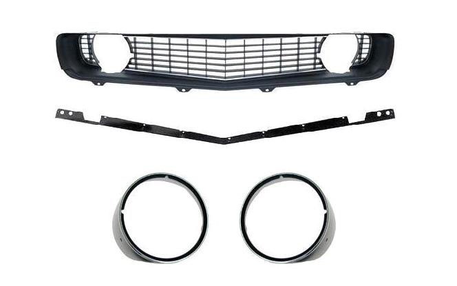 | Description | Camaro standard black grille kit, includes headlamp bezels with Style Trim option RPO Z23 chrome trim ring. Our reproduction grille kits consist of the finest parts available. Reproduction standard black grille (imported) with correct headlamp bezels. Grille replaces original GM part# 3957062. Headlamp bezels replace original GM part# 3935927 LH 3935928 RH. Upper grille stiffener for all 1969 standard or RS Camaro replaces original exactly. Superior quality materials and stamping. Replaces original GM part# 3949707. All parts in this kit are Officially Licensed GM Restorations Parts. |