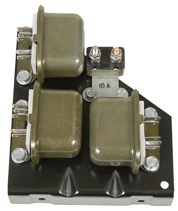 | Description | Camaro Rally Sport relay mounting board. This unit mounts to driver side fender. The relay board holds 3 relays and the circuit breaker. Complete reproduction assembly with all correct parts for 67 Camaro RS. Die stamped steel relay mounting plate with three installed reproduction relays with correct appearance. Stamped script "Delco Remy" on case and "858" stamped into mounting bracket. Correct 10 amp circuit breaker with nuts all mounted with correct plated hardware. Fully assembled. Officially Licensed GM Restoration Parts. The Factory Assembly Manual shows this part in Z22 B7. |