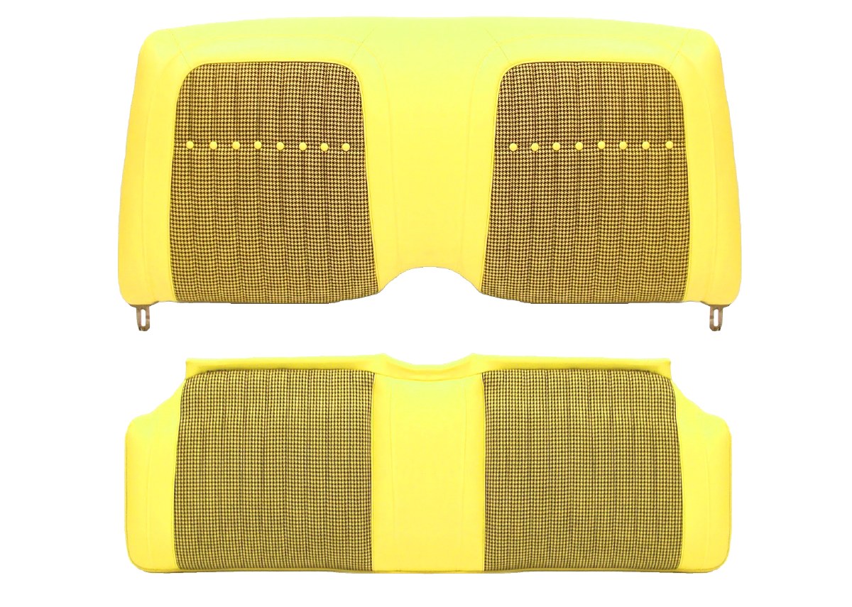 | Description | Camaro convertible deluxe interior yellow & black Houndstooth rear seat covers. Seat covers are distinquished by Houndstooth cloth inserts. The inserts feature vertically stitiched pleats just like the originals (covered seat buttons are included). Our superior quality seat covers are produced by one of the industry's leading manufacturers. Heartbeat City recommends PUI's seat covers and door panels whenever possible. We are proud to offer their products on our website. All of our seat covers and door panels are manufactured in the USA! |