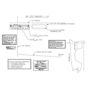 | Description | Camaro 250 Standard or Rally Sport emblem template kit. The solution to installing emblems and body moldings on new sheetmetal. Classic Templates' easy to use full size digitally rendered templates exactly locate all body, fender, hood, header and trunk lid emblem holes quickly and professionally. Template kits also available for 1967-1968 RS lower body moldings, 1969 rear quarter panel louvers, RS backup lamps, antenna hole placement, sidemarker locations, and 1968-1969 Standard to RS fenderwell templates. |