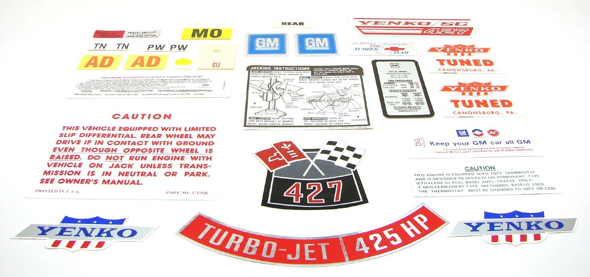 | Description | 1969 Yenko Camaro 427-450 hp decal kit for cars with manual transmission. This decal kit is assembled for your convenience. All major decals are included. Decals for specific options such as Air Conditioning and or leaf spring and coil springs are offered seperately on this website. All decals with AC Delco or GM trademarks or copyrights are Officially Licensed GM Parts. All decals are Manufactured in the USA! |