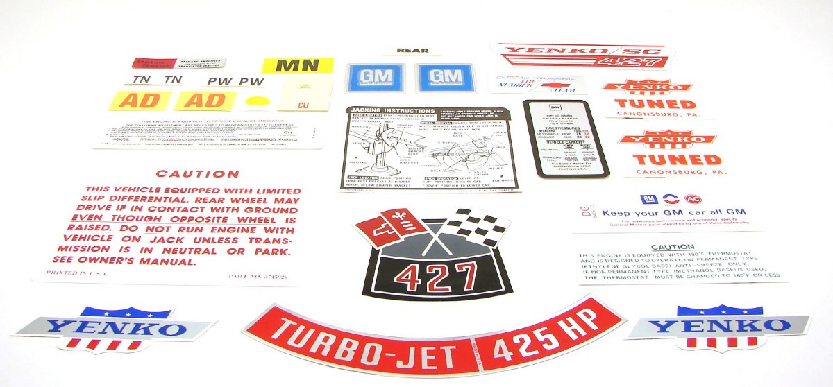 | Description | Camaro 1969 Yenko 427-450 hp decal kit for cars with automatic transmission. This decal kit is assembled for your convenience. All major decals are included. Decals for specific options such as Air Conditioning and or leaf spring and coil springs are offered seperately on this website. All decals with AC Delco or GM trademarks or copyrights are Officially Licensed GM Parts. All decals are Manufactured in the USA! |