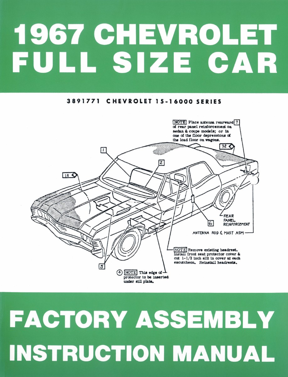 | Description | 1967 Chevy Factory Assembly Manual. The assembly manual shows many facets of the Chevy's assembly processes. This manual is a must for any restoration. You can check part numbers, applications, and torque specifications. The print quality of our assembly manuals is far superior to others on the market. You can actually read everything in these manuals. |