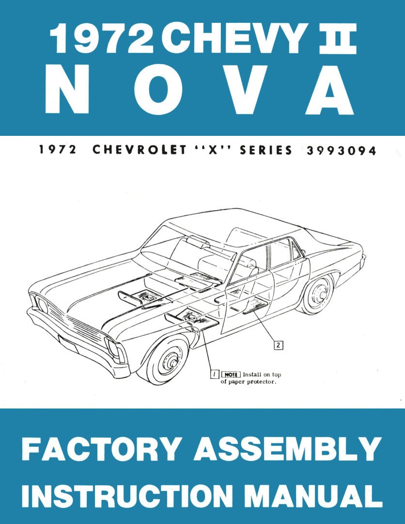 | Description | 1972 Chevy II Nova Factory Assembly Manual. The assembly manual shows many facets of the Nova's assembly processes. This manual is a must for any restoration. You can check part numbers, applications, and torque specifications. The print quality of our assembly manuals is far superior to others on the market. You can actually read everything in these manuals. |