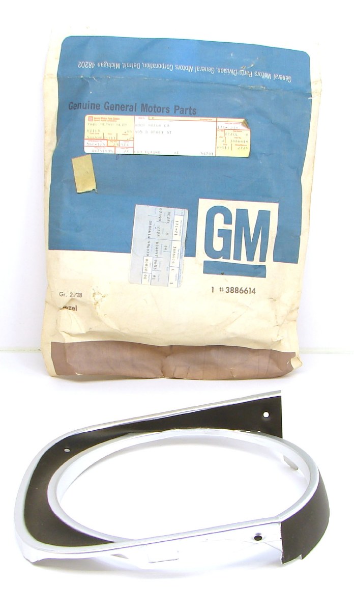 | Description | NOS 1967 Camaro headlight or headlamp bezel, RH or passenger side. Original GM part# 3886613. New in the wrapper. |
