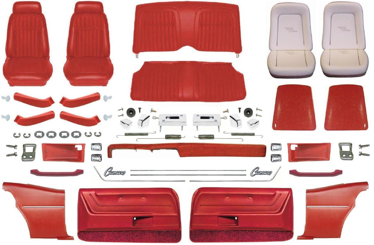 | Description | 1969 Camaro Coupe Master red deluxe comfortweave interior kit. This is the intermediate version of the three different interior kits that Heartbeat City offers. Kit includes deluxe comfortweave front & rear seat covers, USA made bucket seat foams (American Cushion Industries), OE style bucket seat backs (color matching), bucket seat hinge covers (color matching), Seat headrests assemblies (best quality), headrest escutcheons, complete bucket seat restoration hardware kit including knobs, seat adjuster springs, seat back latches, all required seat hardware, seat back rubber bumpers & screws, deluxe interior molded front door panels, deluxe door panel plastic cups (color matched) Deluxe Camaro door panel emblems, deluxe door panel moldings, deluxe door panel grab handles & chrome bezels, rear deluxe interior side panels, urethane dash pad, pillar post pads, original style molded 80/20 loop 2 piece front & rear carpet set, OE style sound deadner, rear window package tray & insulation, trunk divider panel with insulation, high quality OE style sunvisors, OE style headliner kit with pre-covered sail panels, door jamb windlace (black only), technically correct USA made "Body by Fisher" door sill plates, and one 12 oz can of acrylic lacquer interior paint. |