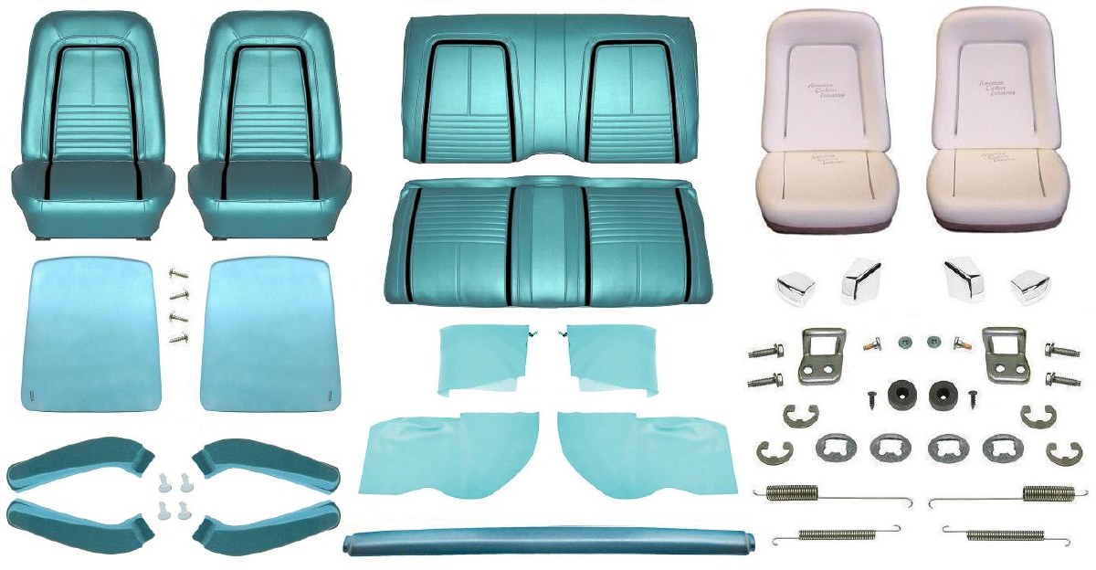 | Description | 1967 Camaro Convertible Monster turquoise deluxe interior kit. This is the premium interior kit of the three different interior kits that Heartbeat City offers. Kit includes: Deluxe interior front bucket seat and rear seat covers, bucket seat foams, OE style bucket seat backs (color matching), bucket seat hinge covers (color matching), complete bucket seat restoration hardware kit including knobs, seat adjuster springs, seat back latches, seat back rubber bumpers and all required hardware. OE Style molded deluxe interior front door panels, deluxe interior Camaro door panel emblems, OE style interior rear side panels, rear ashtray & well covers, RH & LH deluxe interior door handles, door lock knobs, door lock knob ferrules, door panel water shields, OE style vinyl wrapped dash pad, original style molded 80/20 loop 2 piece front & rear carpet set, plastic firewall carpet guard, OE style sound deadner, trunk divider panel without insulation, high quality OE style sunvisors, sunvisor tips & sleeves, window cranks (black only), window crank springs & washers, door jamb windlace (black only), and a pair of technically correct USA made "Body by Fisher" door sill plates and complete interior screw kit which includes 263 pieces individually packaged for your convenience..................."Interior Screw Kit" includes correct fasteners to attach the following: Air outlet bezels, air vents in door jambs, ashtray retainer, coat hooks, console & door & hinge & lamps, courtesy lamps, dash pad, dimmer switch, door panels, door handles, firewall insulation pad, glove box door & latch & liner, grab bar, heater control, instrument cluster, kick panels, mirror, name plates, pillar moldings, quarter window glass weatherstrips, quarter trim panels, radio trim panels, radio control shafts, sill plates, rocker cover harness plates, seat back bumpers and strikers, seat back cables seat back panels, rear seat to body, seat pivot clips & covers, seat tracks, floor shifter plate, shoulder harness retainers, steering column to dash, & cover, steering column to firewall, steering wheel shroud, sunvisor brackets & clamps, turn signal lever, window cranks, and vent window channels. |