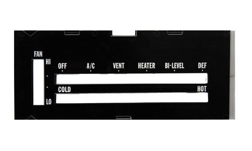 | Description | Heater control lens, with Air Conditioning. Crystal clear acrylic lens with white scripts. Includes a new die-stamped, automotive grade, moisture-resistant paper backing. New retaining clips are sold separately. Applications: 1973 Camaro. |