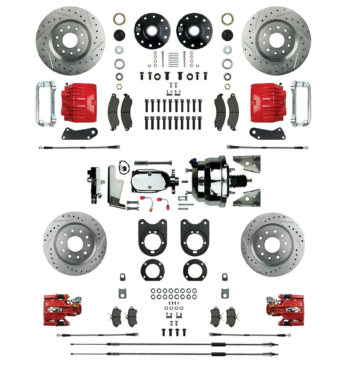 | Description | Signature Series Big Brake Conversions with the Chrome Package Upgrade offer performance and style in one comprehensive kit. Upgrades abound with this product chrome booster & master assembly front twin piston calipers with clean visible branding drilled and slotted rotors for extreme performance and of course stainless brake hoses. |