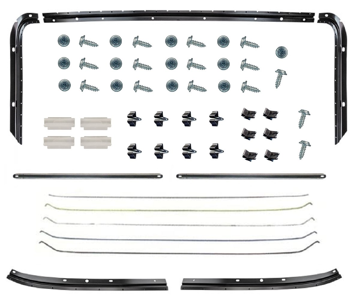 | Description | Compete headliner installation kit with all parts required to install except the headliner itself and the glue. You will receive the headliner tacking strips for both the front window (2 piece) and the rear window (3 piece), fasteners for both tacking strip sets, you will also receive the color coded headliner bow tension rods, headliner bow rod retainers (4), headliner insulation not photographed (see part# INT-1752), sail panel tacking strips and the rear headliner tacking strip retainer set. Applications: 1967-1969 Camaro & Firebird. |