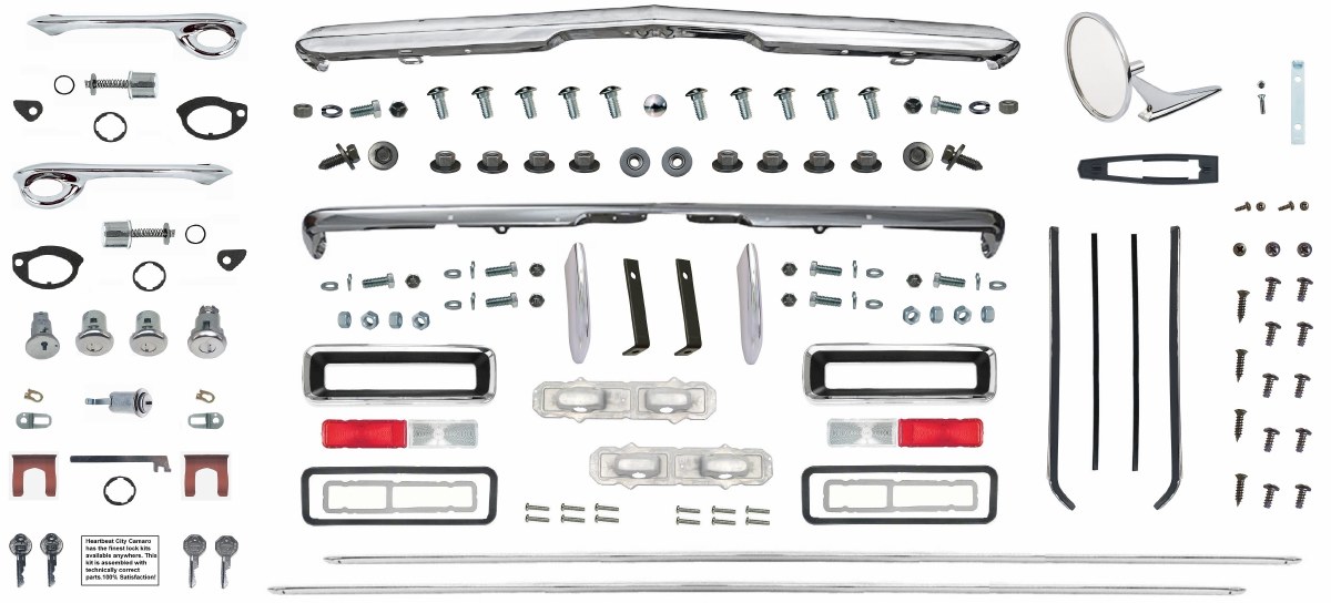 | Description | 1967 Camaro Convertible Standard Body Molding & Chrome Kit. Heartbeat City has specifically created this kit to show our clients that there are some outstanding parts available to install on your freshly painted car. All of the parts in this kit are excellent in quality, fit, and finish. You will receive the higher quality front and rear bumpers, OE style bumper bolt kit, rear bumperettes (below the rear bumper), OE quality driver's side door mirror and mounting kit, 1 pair of rocker spears, Assembly Line Correct installation kit for the rocker spears, "Assembly Line Correct" Complete lock kit with correct gaskets, door cylinder retainers, and the correct length trunk lock shaft, outside OE Style thick door handles with push buttons and screws. In addition to the previously mentioned parts, you will also receive the very best taillight assemblies complete with molded rubber body gaskets, taillight lens gaskets, backing plates, mounting nuts, screws, taillight lens, back up light lens, our highest quality front convertible windshield moldings with "Assembly Line Correct" Installation clips with hardware, a pair of quarter window moldings with inserts, convertible chrome header moldings, chrome installation screws, convertible windshield wide pillar stainless steel moldings, stainless steel rear pinchweld moldings and molding clip set. Applications: 1967 Camaro convertible. |