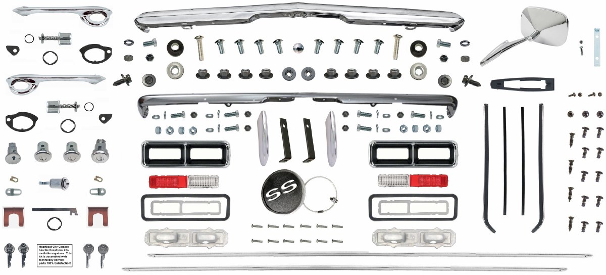 | Description | 1968 Camaro Coupe Super Sport Body Molding & Chrome Kit without Style Trim Z21 Option. Heartbeat City has specifically created this kit to show our clients that there are some outstanding parts available to install on your freshly painted car. All of the parts in this kit are excellent in quality, fit, and finish. You will receive the higher quality front and rear bumpers, OE style bumper bolt kit, rear bumperettes (below the rear bumper), OE quality driver's side door mirror and mounting kit, 1 pair of rocker spears, Assembly Line Correct installation kit for the rocker spears, "Assembly Line Correct" Complete lock kit with correct gaskets, door cylinder retainers and the correct length trunk lock shaft, outside OE Style thick door handles with push buttons and screws. In addition to the previously mentioned parts, you will also receive the very best taillight assemblies complete with molded rubber body gaskets, taillight lens gaskets, backing plates, mounting nuts, screws, taillight lens, back up light lens, our highest quality convertible front windshield moldings with "Assembly Line Correct" Installation clips and hardware, a pair of quarter window moldings with inserts, 1 pair of OE Quality Super Sport SS Hood louvers, 4 side marker lamps with chrome bezels, convertible chrome header moldings, chrome installation screws, convertible windshield wide pillar stainless steel moldings, stainless steel rear pinchweld moldings and molding clip set, and an OE Quality Super Sport gas cap. Applications: 1968 Camaro Super Sport Without Style Trim RPO Z21 |