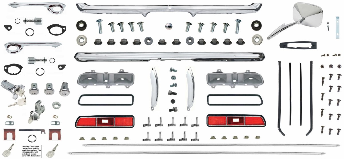 | Description | 1969 Camaro Convertible Standard Body Molding & Chrome Kit. Heartbeat City has specifically created this kit to show our clients that there are some outstanding parts available to install on your freshly painted car. All of the parts in this kit are excellent in quality, fit, and finish. You will receive the higher quality front and rear bumpers, OE style bumper bolt kit, rear bumperettes (below the rear bumper), OE quality driver's side door mirror and mounting kit, 1 pair of rocker spears, Assembly Line Correct installation kit for the rocker spears, "Assembly Line Correct" Complete lock kit with correct gaskets, door cylinder retainers, and the correct length trunk lock shaft, outside OE Style thick door handles with push buttons and screws. In addition to the previously mentioned parts, you will also receive the very best taillight assemblies complete with taillight housings, molded rubber body gaskets, taillight lens gaskets, taillight lens, our highest quality convertible front window moldings with "Assembly Line Correct" Installation clips with hardware, a pair of quarter window moldings with inserts, 4 side marker lens, 4 chrome side marker bezels, 4 foam gaskets, and 8 pal nuts, convertible chrome header moldings, chrome installation screws, convertible windshield wide pillar stainless steel moldings, stainless steel rear pinchweld moldings and molding clip set. Applications: 1969 Camaro. |